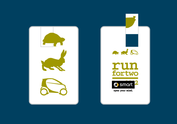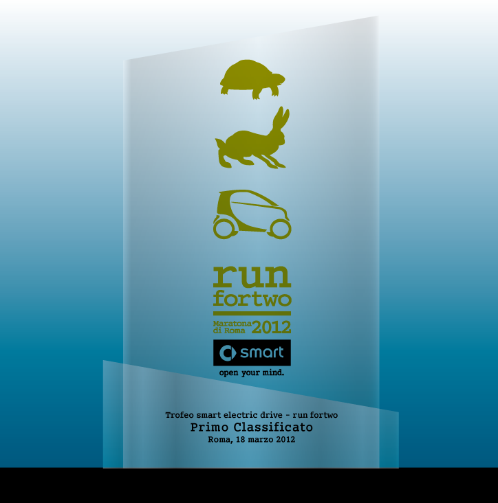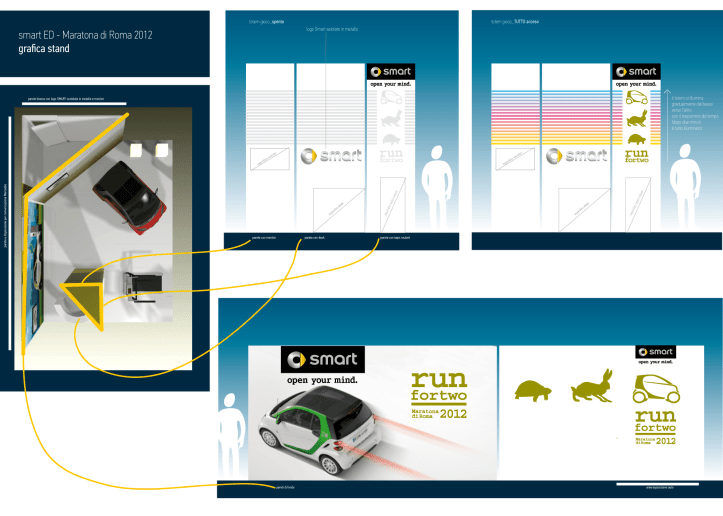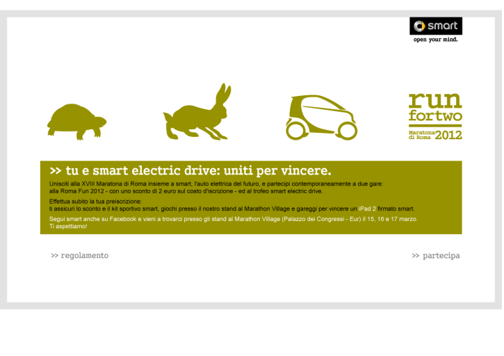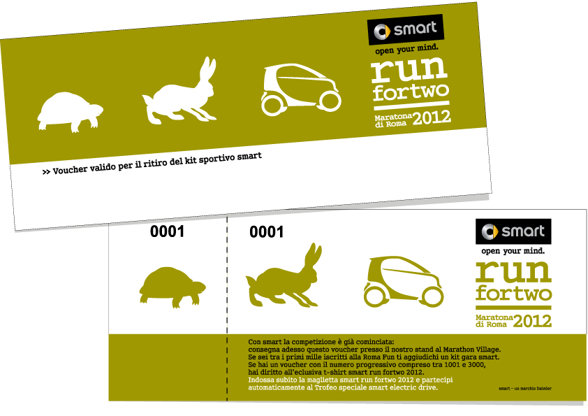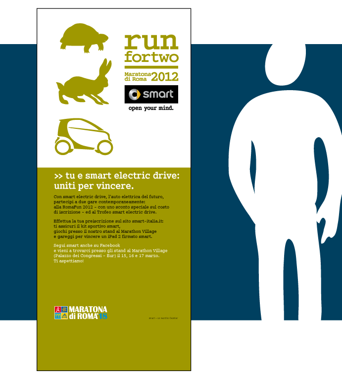 Sponsorizzazione evento XVIII Maratona di Roma 2012. Ideazione naming, logotipo ed immagine coordinata, scenografie aree espositive interne ed esterne, targa Trofeo electric drive, concorso online web/facebook, gioco a premi offline, rollup concessionarie, voucher e gadget. Cliente: smart Italia. Agenzia: 360 Treseizero srl. Art director Alessandro Ceci, copywriter Vincenzo Nizza